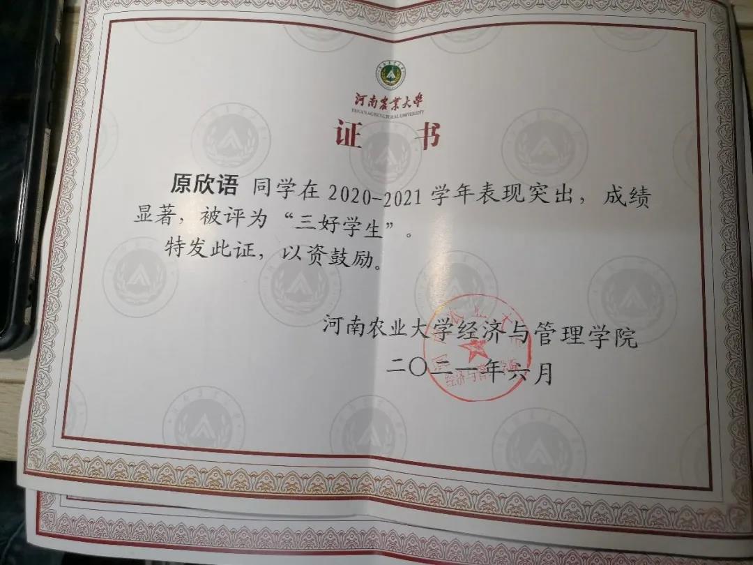 2019级农林经济管理1班学生,2021年度国家奖学金获得者。曾获得国家励志奖学金、校三好学生、院三好学生等荣誉,顺利考取了初级会计证书、英语四六级等相关证书。
