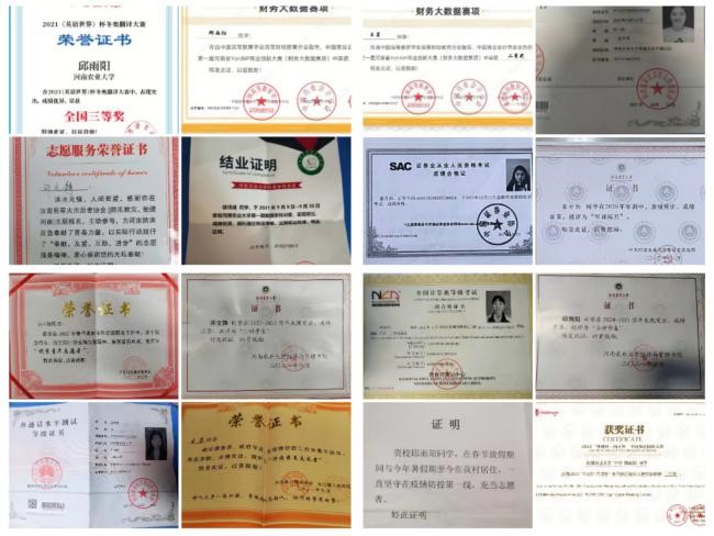 “放飞青春”主题演讲比赛一等奖,2021年9月获得外研社.国才杯英语阅读大赛校级初赛三等奖,2021年8月获《英语世界》杯冬奥翻译大赛全国三等奖,代表学院参加“歌声飘过100年”红歌赛获特等奖,2021年参与河北石家庄抗击疫情志愿者活动。已考计算机二级优秀证书,驾驶证,英语四级已过。秦丹阳:已考过证券从业资格证,英语四级,曾获军训标兵荣誉称号。