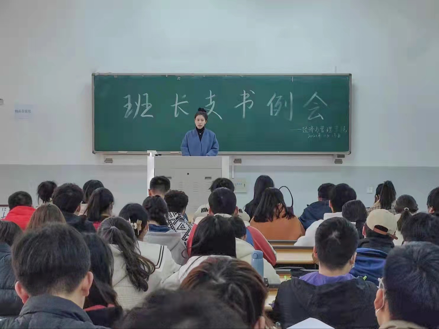 于教学楼D106召开第十一周班长支书例会。院团委副书记李月、院团委老师张桂玲、戚亚薇到场出席,19、20、21级班长支书积极到场参加。