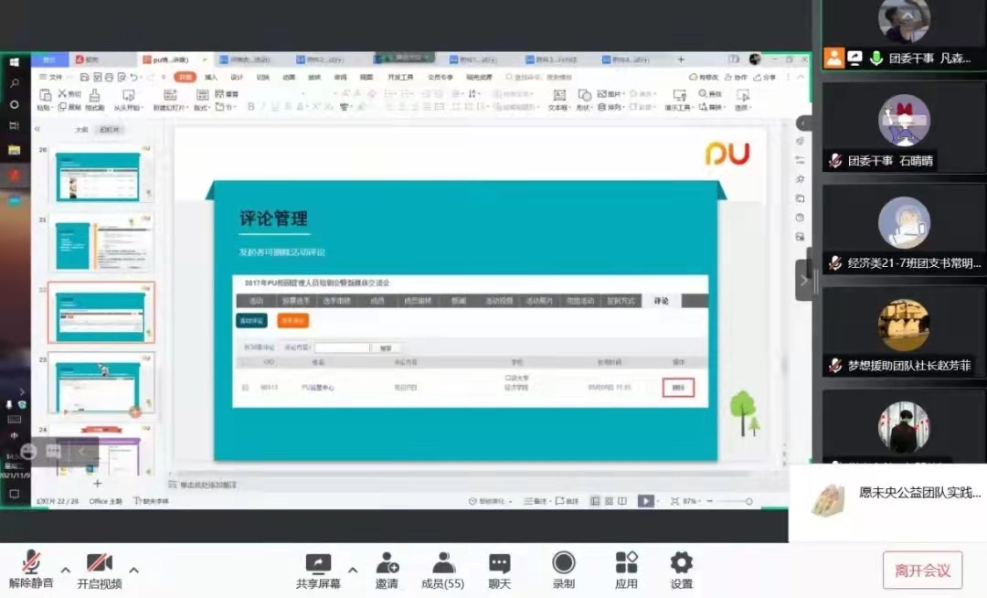 会议伊始,团委干事凡森向参会同学阐述了第二课堂在大学学习生活中的重要意义,并仔细讲解了“pu学时”的必要性。他围绕发起、审核、通过、实行、完成等五个第二课堂活动开展的重要步骤进行宣讲,让在座同学对活动申请有了进一步的了解。同时,凡森强调了班级、社团、学生组织申请活动应归属的范围及标题格式等具体信息。最后,团委委员郑梦飞进行补充说明,对活动简介字数、申请时间、签到方式做出提醒,本次线上宣讲活动落下帷幕。