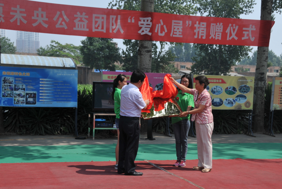 校工会主席褚金海与焦作市人大常委会副主任穆玉华共同为“爱心屋”揭牌。褚金海主席在揭牌仪式后的讲话中对焦作市有关领导和社会各界爱心人士表达了谢意,向福康学校教职员工表示了敬佩,向学校智障儿童和参加本次社会实践活动的愿未央团队成员表示慰问和问候。褚主席还对愿未央公益团队自2012年成立以来所作的公益活动给予了充分肯定和高度赞扬,并勉励愿未央公益团队在以后的公益活动中更加专业化和规范化,用实际行动帮助更多的孤残儿童实现愿望,努力成为福利院儿童的快乐使者、成为爱心人士与福利院对接的有效“桥梁”。