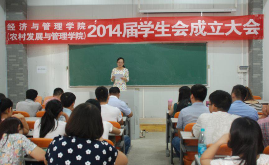 2014届学生会成立大会在龙子湖校区兰亭大四举行。院团委书记郭娟、副书记王金铎、党委组织员张倩、团委老师黄妍、杨鑫、杜世杰及100多名学生干部参加了会议。会议由张倩老师主持。