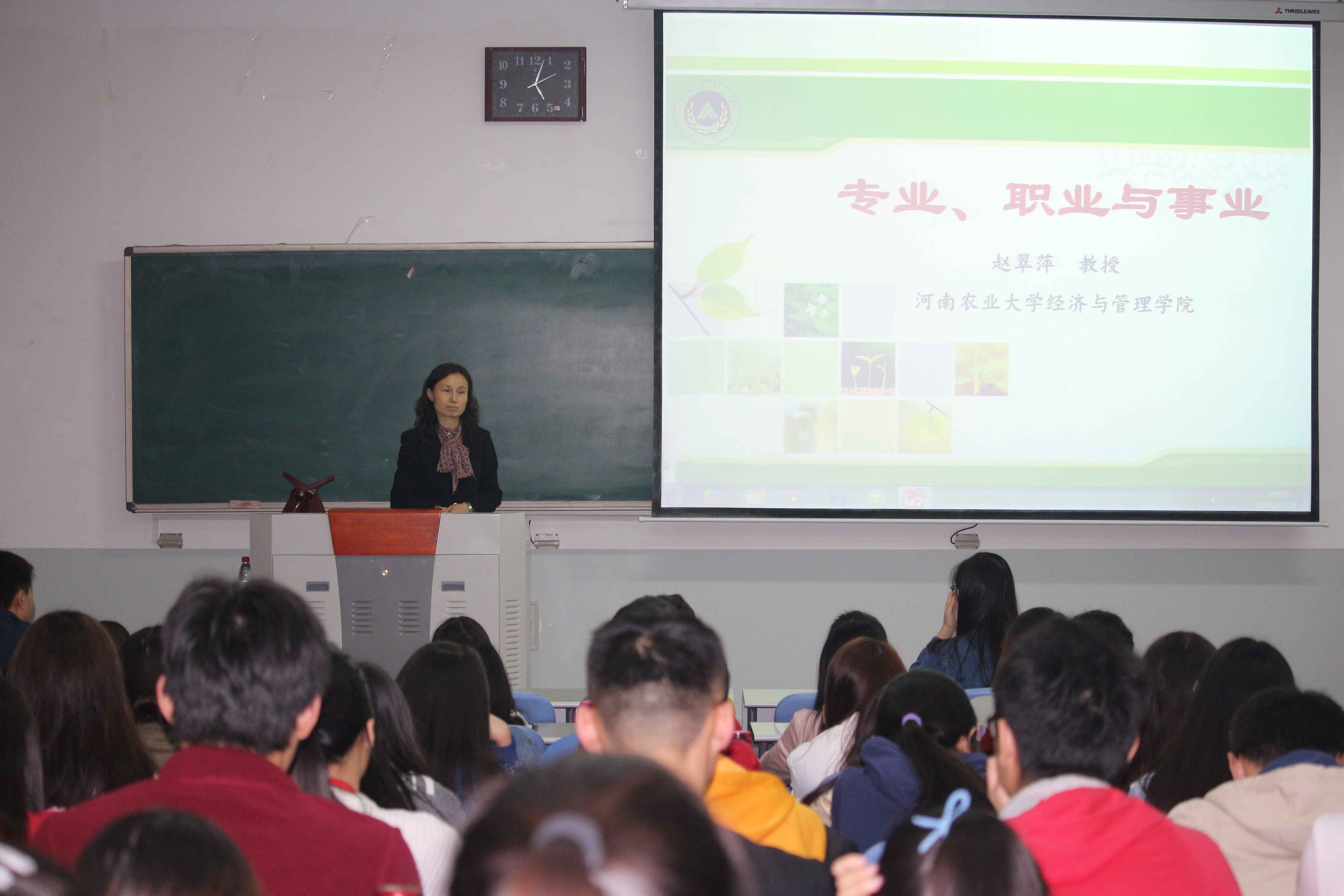 首先,赵翠萍教授向同学们介绍了如何理解本科阶段的专业。她从专业的含义、专业与职业的关系和专业对口等方面向同学们进行了介绍,使同学们对专业有了初步了解。她指出,同学们要树立专业概念,并提出了具体要求。同时也告诉同学们不能拘泥于本专业,要广泛地学习,并设立好目标。在场同学们认真听讲,积极互动,现场气氛活跃、热烈。接着,赵翠萍教授又向同学们提出了学习农林经济专业的建议。要求同学们要专业广泛阅读,勤于思考和动笔,达到基本专业水准。最后,副院长何泽军就赵翠萍教授的报告做了简短精练的总结,此次讲座在同学们热烈的掌声中圆满落下帷幕。