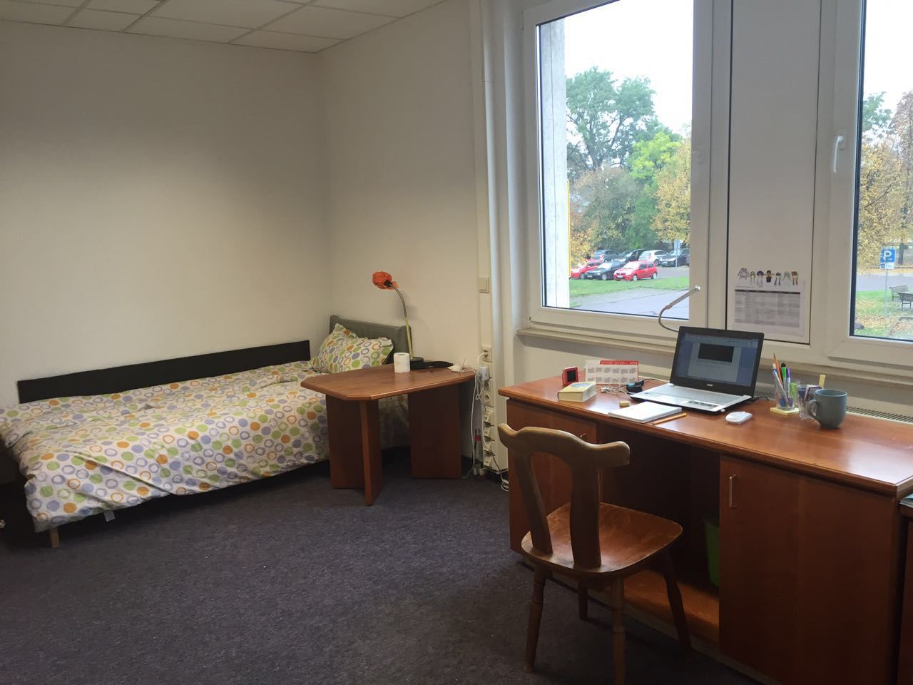 单人单间,有床、书桌和衣柜:
