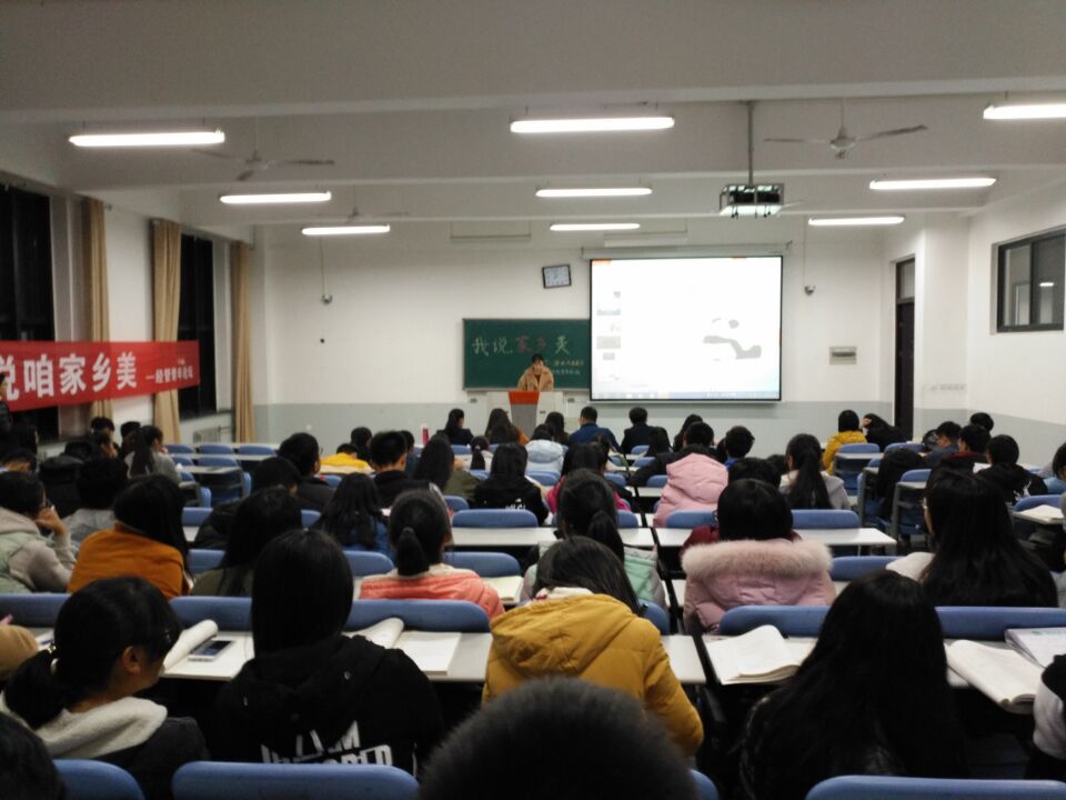 在主持人的精彩开场后,比赛正式拉开帷幕。各班参赛选手按照赛前抽签顺序依次进行PPT展示。各参赛班级的代表通过生动的PPT展示,简洁有力的演讲,展示了自己独特的家乡风貌。作品别出心裁,各具创意。现场观众热情高涨,气氛活跃,掌声不断。经过各班同学的精彩展示和评委评比,经济16-5班获得一等奖,经济16-3班,农经16-1班获得二等奖,经济16-4班,工商16-2班,国贸16-1班获得三等奖。