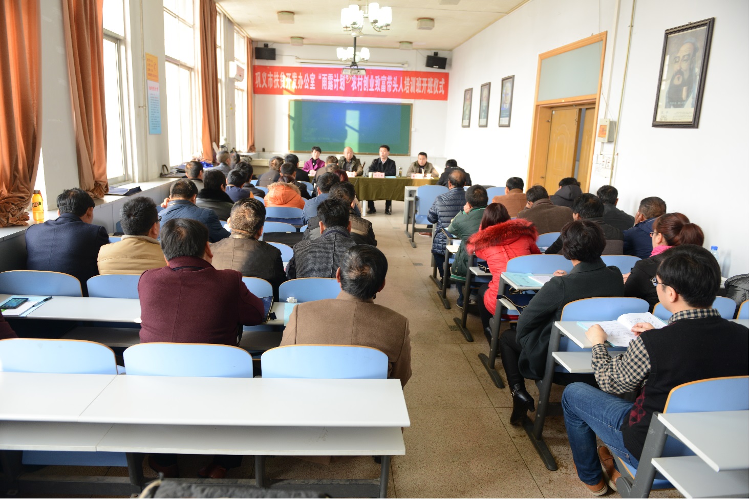 在文化路校区图书馆报告厅成功举办“雨露计划”农村创业致富带头人培训班。来自巩义市各乡镇的35名学员参加培训,河南省扶贫办刘宏敏处长、巩义市扶贫办曲孝生主任、学院党委罗伟书记出席培训班开幕式。
