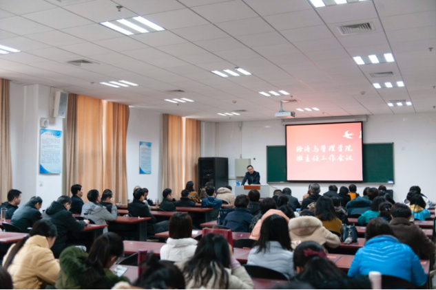 在教学楼B208教室举行班主任工作会议,此次会议由院党委书记牛青杨主讲,抖阴