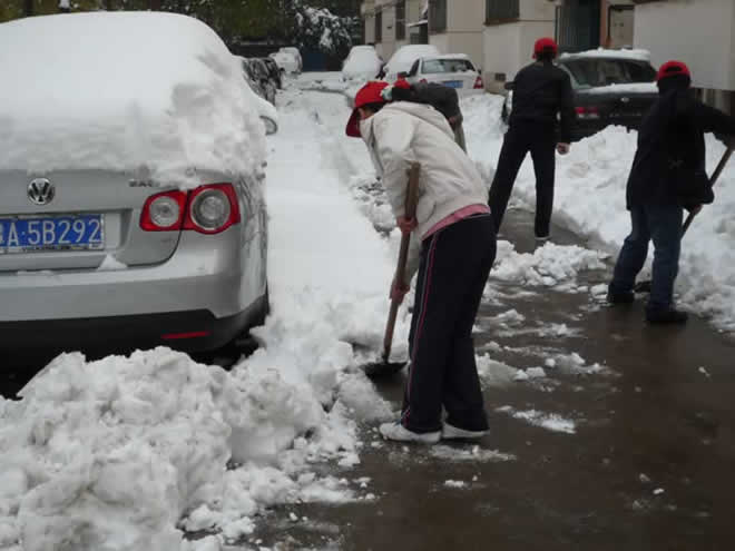 在志愿者和热心同学们的共同努力下,经过多个小时的奋战,三区各主干道的积雪都被及时清理,车辆和行人的安全得到了有效的保证。