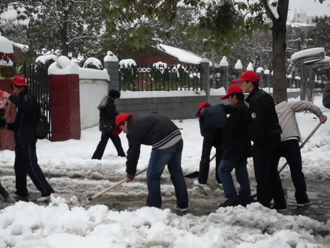 志愿者协会的同学在团委老师的带领下到教师第三家属区开展热火朝天的清扫积雪活动。一顶顶红艳艳的帽子犹如一颗颗火红跳动的心,成为校园一道独特的亮丽风景。他们不畏严寒,如火如荼的忙碌着,脸冻僵了,手麻木了,可是他们没有一句怨言,老师和志愿者们的热忱感染了路过的同学,也纷纷前来帮忙。他们合理分工,配合默契,利用扫帚、铁锨等工具对道路上的积雪进行清理,一条条道路上的积雪被扫得干干净净。