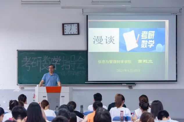 首先,曹殿立教授从介绍研究生考试类型开始讲起,通过多年考研指导的经验,告诉同学们为什么要考研以及考研的类别和科目并着重介绍了数学试卷的结构、题型和分值分布,结合自己一线教学经验,告诉同学们考研数学的特殊性和重要性,以及在备考过程中要注重基础知识的学习和题型的总结。接下来曹教授总结了三点复习方法:首先要全面复习,打好基础;二是结合考研辅导书复习,形成体系;三是巩固提高,做历年真题和模拟题,通过不断发现问题提高自我。曹教授告诉同学们一定要整体把握,才能做到融会贯通,成竹在胸,并希望同学们在备研过程中能够保持良好的心态。最后,曹教授为同学们答疑解惑,并推荐了一些考研数学辅导书,鼓励同学们不要畏惧前进路上的困难,要相信自己的能力。本次指导会在同学们热烈的掌声中落下了帷幕。