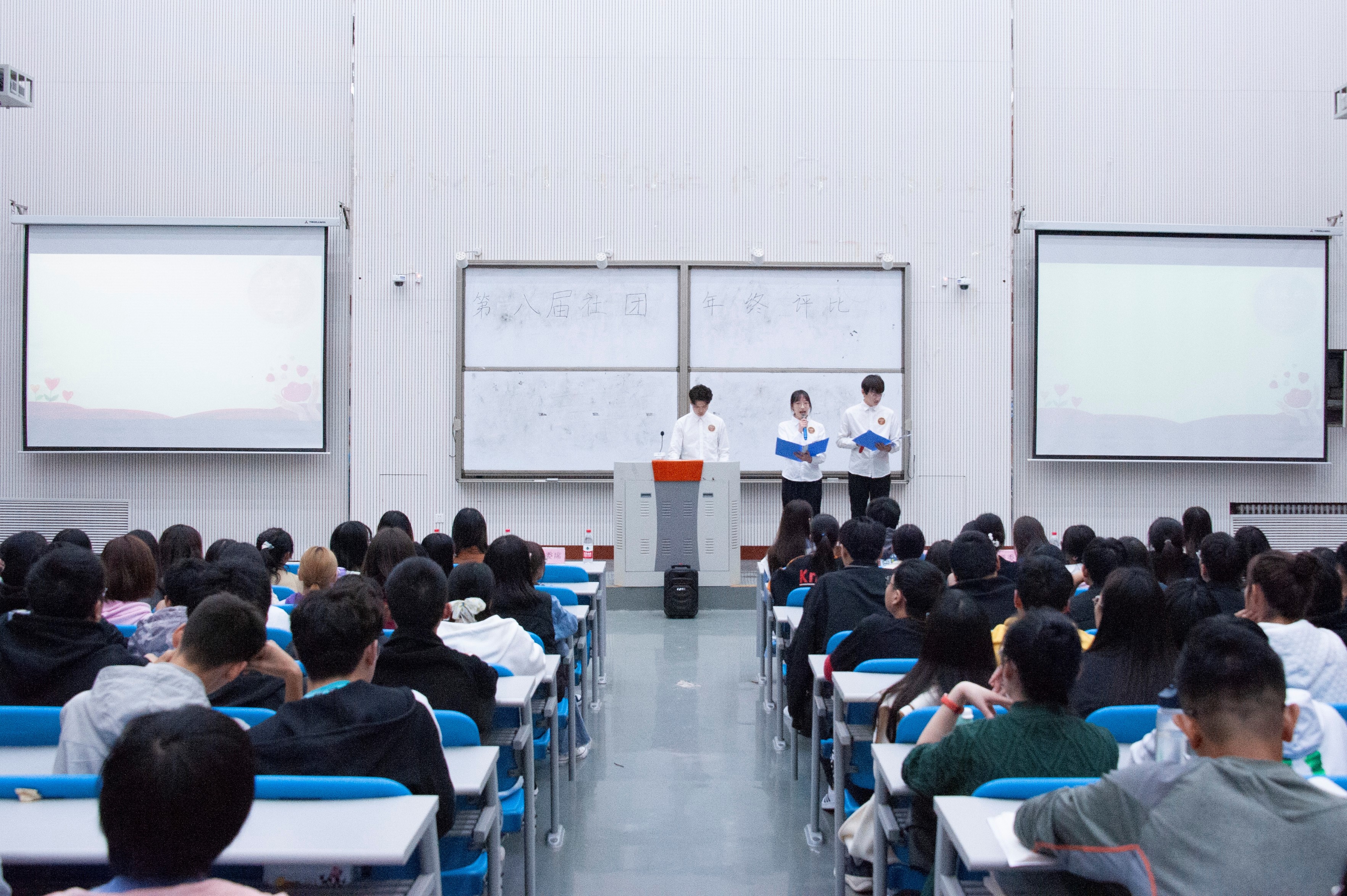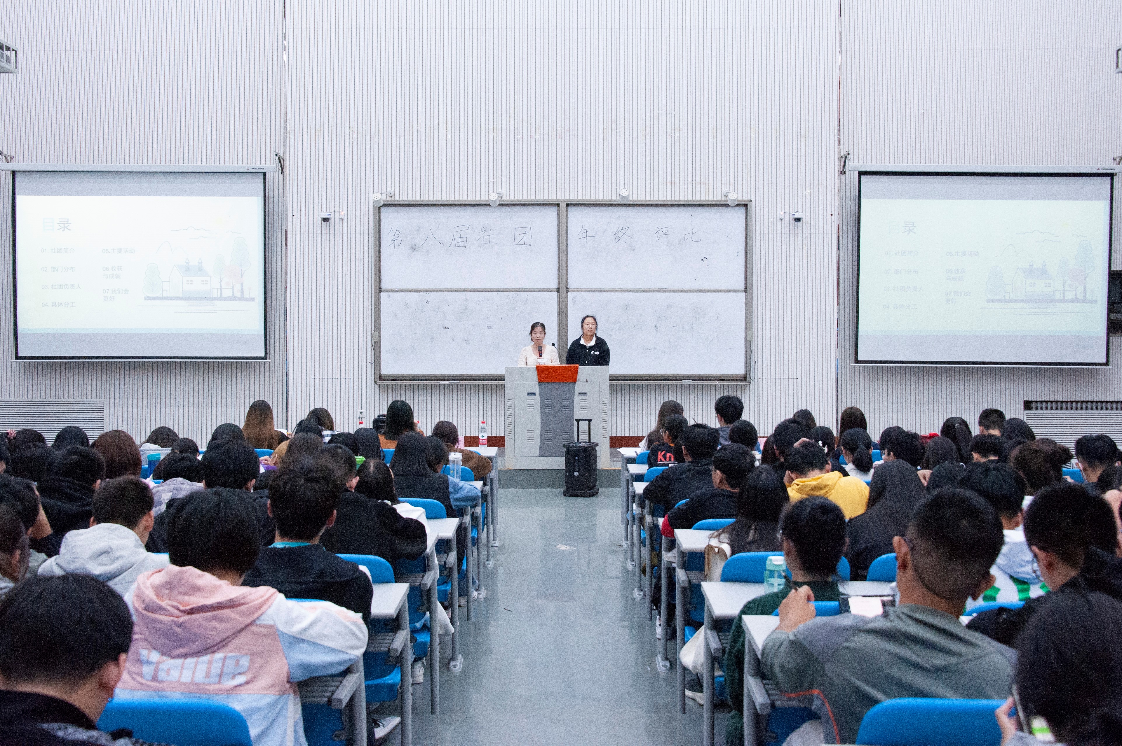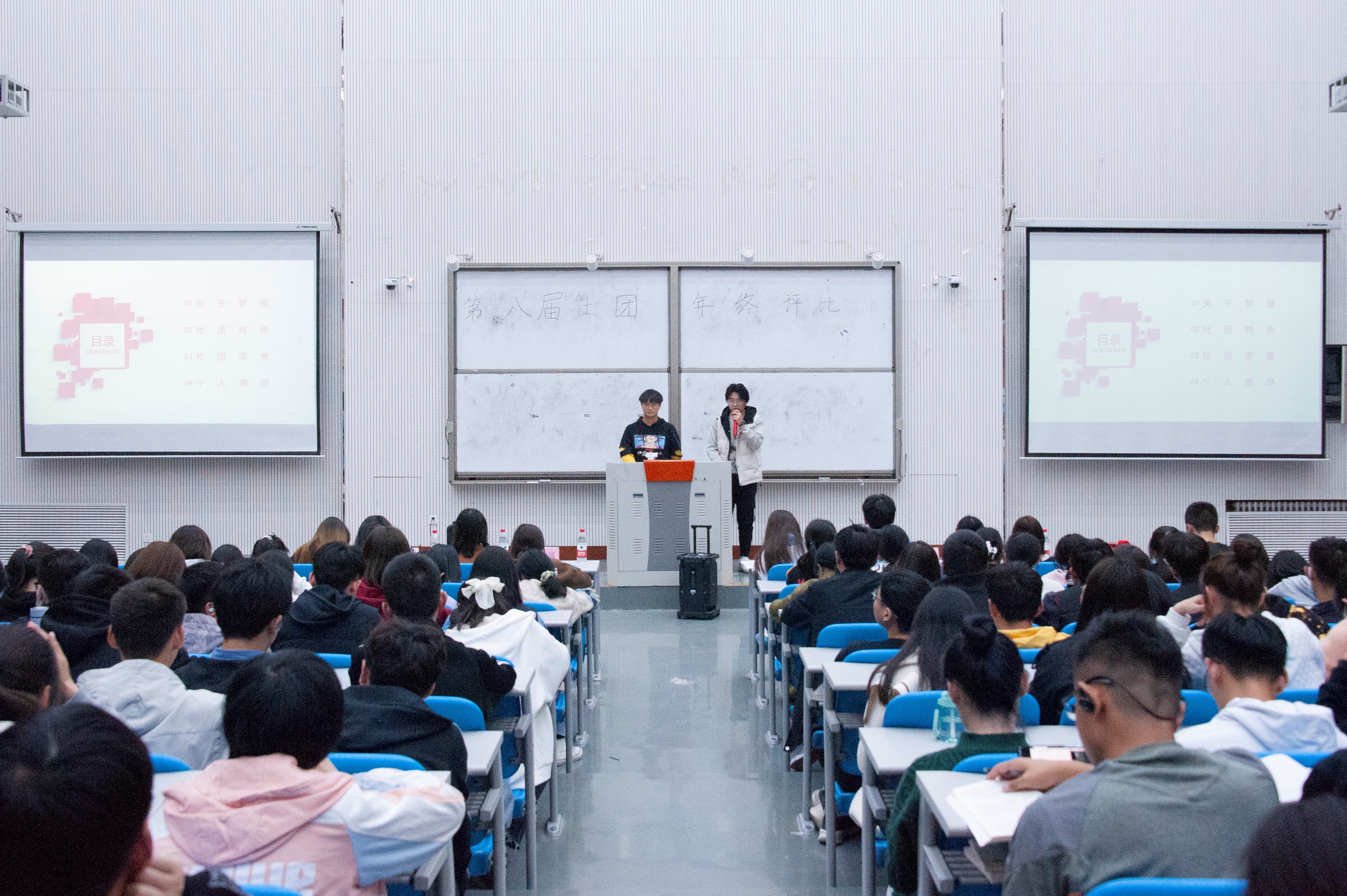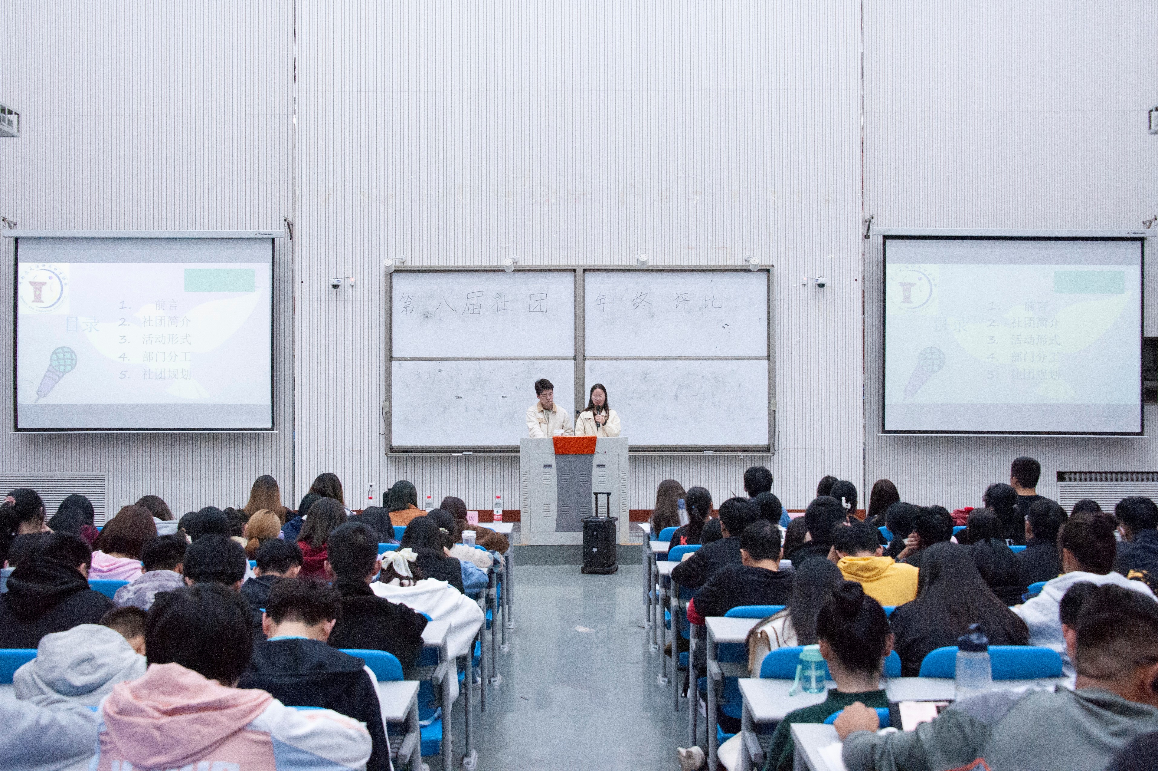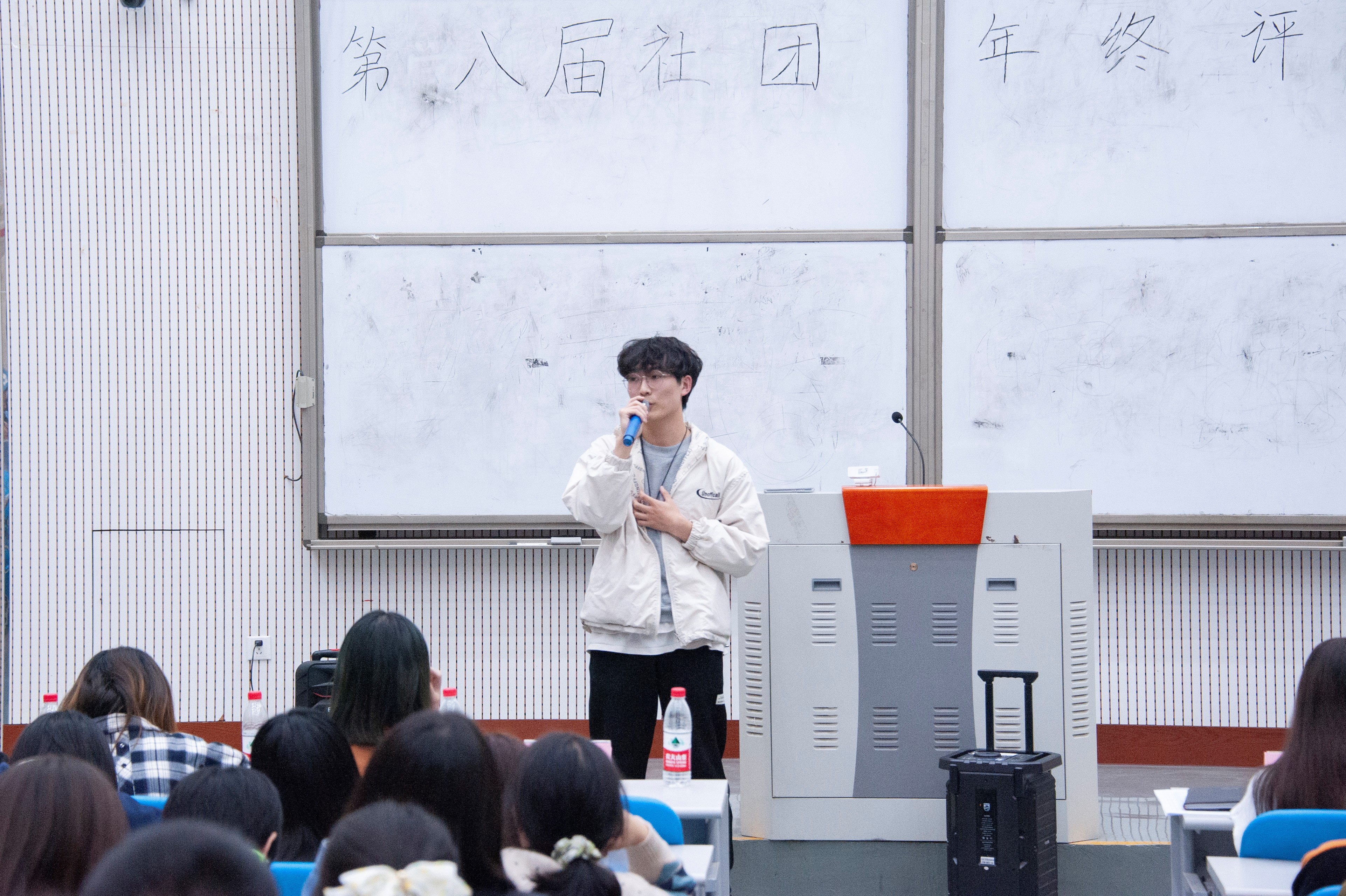 活动开始前,评委老师、各社团成员和新生依次入座。在主持人宣读了评比规则后,此次社团评比活动正式拉开了帷幕。活动伊始,社团部部长韩紫绿首先简单介绍了近来社团的发展状况,围绕工作章程、工作总结以及社会影响力等三个方面肯定了过去一年里各个社团的工作成果,同时也向大家陈述了未来一年的工作计划。