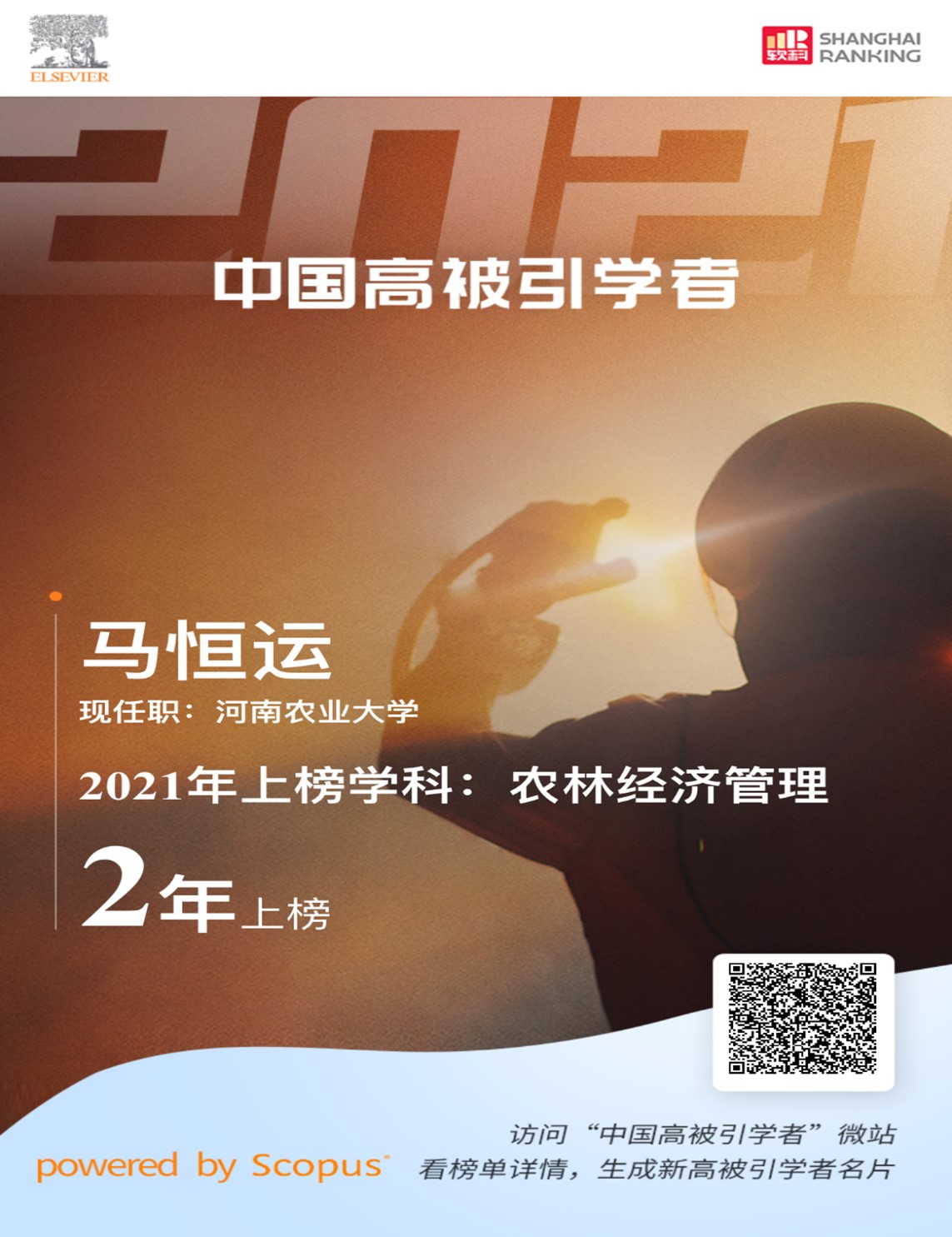 马恒运:教育部长江学者特聘教授,抖阴 院长,教授,博士生导师。国家社科基金会议评审组专家,Energy Economics副主编,教育部农林经济管理本科专业教指委成员。18个国际农业和能源环境经济期刊匿名审稿人。主要研究农业经济理论与政策、要素投入行为、能源经济理论与政策、计量经济和应用统计方法。主持国家自然科学基金、国家社科基金、国际合作以及河南省人才支持等项目27项;在American Journal of Agricultural Economics、Food Policy、Energy Economics、Agricultural Economics、Journal of Productivity Analysis、Renewable and Sustainable Energy Reviews、Environmental Modeling & Software、Australian Journal of Agricultural and Resource Economics、Energy Policy等国际著名农业经济和环境经济期刊发表SCI/SSCI论文50余篇。