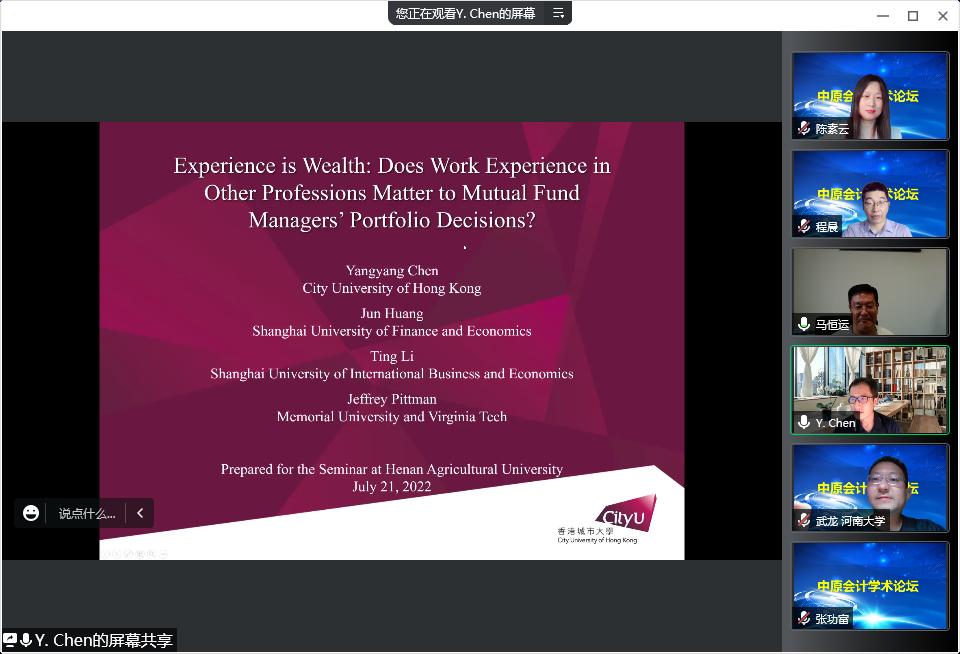 师生作了题为“Experience is Wealth: Does Professional Experience Matter in Mutual Fund Managers' Portfolio Decisions?(经验就是财富——其他行业的工作经验对共同基金经理的投资组合决策是否重要?)”的线上报告。报告会由抖阴
