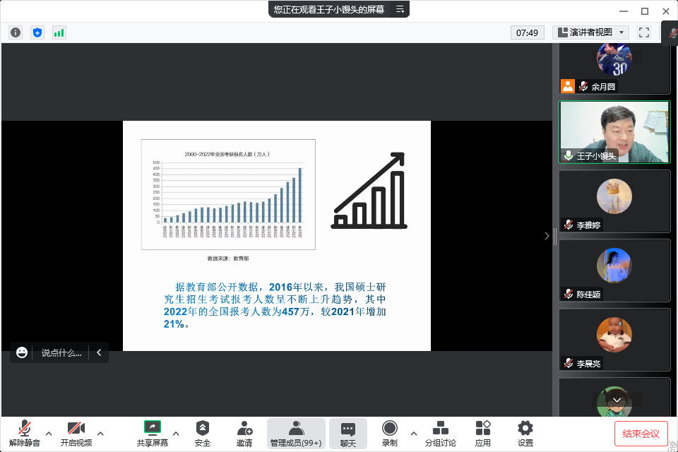 刘瑞峰从国家近十年考研形势、学院近三年考研人数、学院近三年考研上岸学生成绩分布、温馨提醒等方面进行分析解读,帮助学生明确当前阶段的重点任务,引导学生探索、认知自我,帮助学生“精准定位”,他强调,选择和努力同样重要,考研选择一定要对自身水平有更加冷静和清晰的判断,切忌盲从,能否上岸关键在于是否坚定方向、坚持选择。另外,刘瑞峰也介绍了抖阴 的师资情况及近年来的招生情况,详细说明了本院研究生也是不错的选择。在提问环节,同学们积极参与,从专业选择、就业方向、心态调整等方面提出自己疑问,而刘院长也通过大量的实例深入浅出地为同学们答疑解惑。