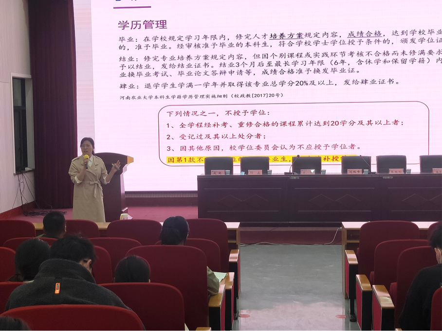 赵艳从教学角度出发,对各专业毕业要求、学位补授条件、实习环节时间进度节点、相关材料整理注意事项进行详细解说,让同学们更深入地了解如何才能顺利拿到毕业证、学位证。