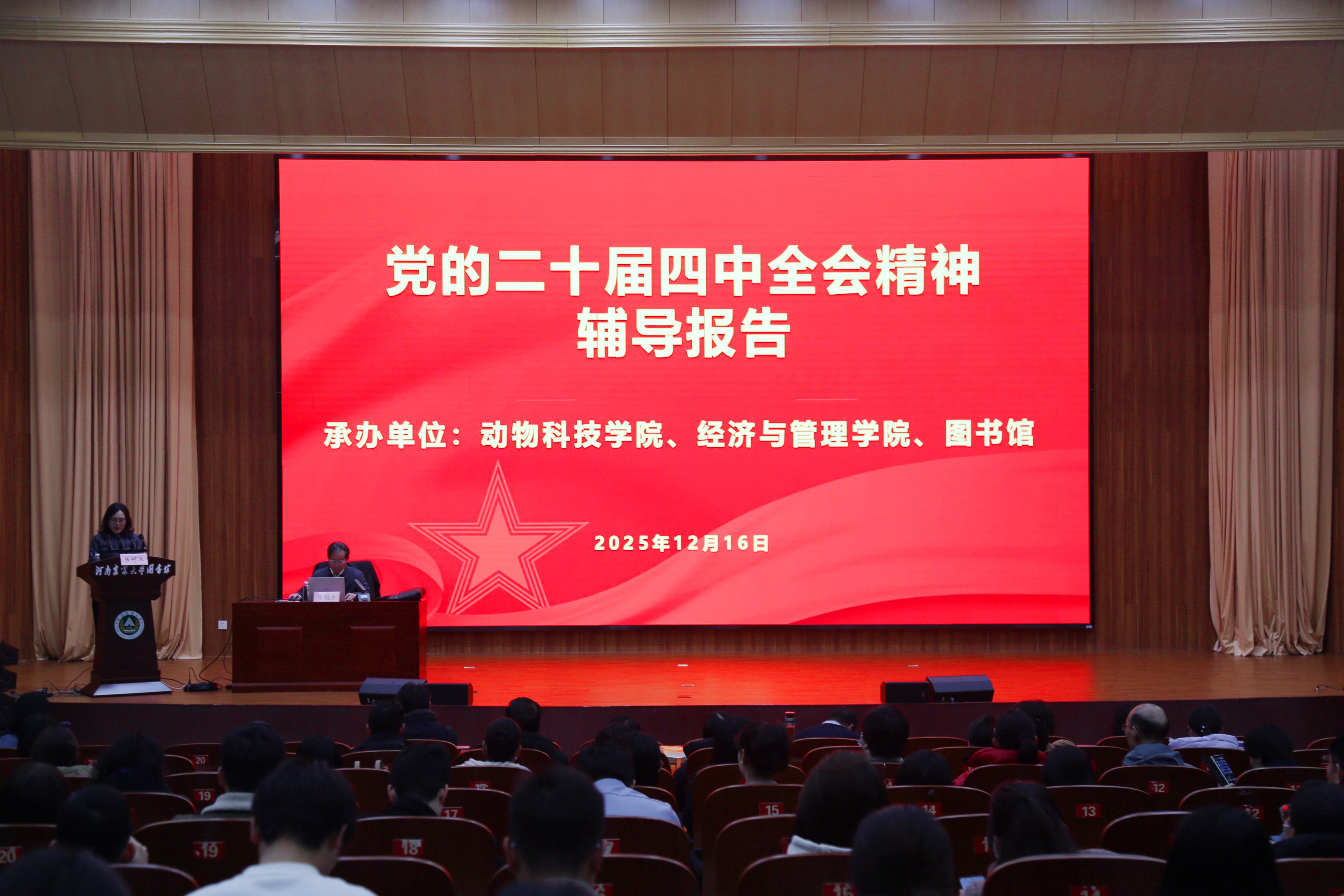 联合动物科技学院、图书馆特邀中共河南省委党校(河南行政学院)校务委员会委员、党组成员李剑力教授作学习贯彻党的二十届四中全会精神专题报告,三个单位的师生代表300余人积极到场参加。