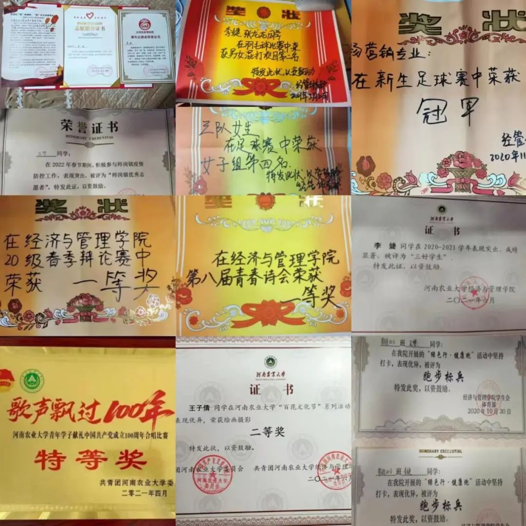 四位同学通过全国计算机等级二级考试并获得证书;六位同学全部通过全国普通话等级考试并获得证书;三位同学辅修了法学且在最终期末考试中无挂科现象;六名同学成绩每学期都是班级前十;宿舍曾获得优秀宿舍荣誉,宿舍长曾获得优秀宿舍长荣誉;宿舍两位同学分别担任班级干部——女工和学习委员;两位同学分别获得院级优秀团员和三好学生荣誉;两位同学曾获得国家励志奖学金;宿舍四位同学一起参加了学院“我爱背单词的活动”并获得三等奖;一位同学曾代表专业在“我在农大的第一年”给大一新生演讲;一位同学曾在青年论坛的分享活动中与大一新生分享学习经验;宿舍有三位同学分别在院青年志愿者协会担任实践部副部长、外联部副部长、院演讲与口才协会担任办公室副部长。