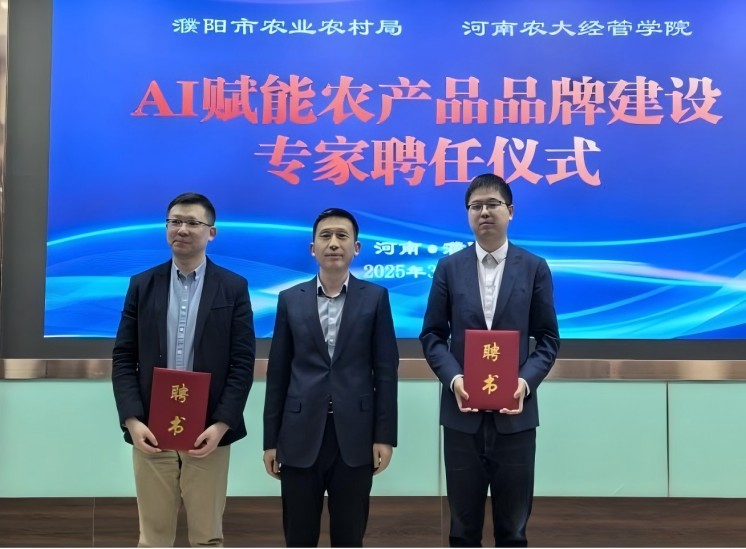 张朝辉老师围绕“AI赋能农产品品牌建设”作专题报告。濮阳市农业农村局聘请抖阴 张朝辉、安琪2名教师为濮阳市农产品智慧品牌建设顾问并当场颁发聘书会后,副院长赵友平带队前往濮阳市特色农产品企业大地密码进行实地调研,就开展人才培养模式创新等具体事宜进行了深入交流。