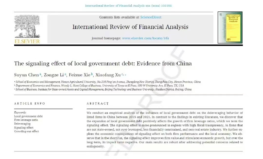 International Review of Financial Analysis,论文题目为“The signaling effect of local government debt: Evidence from China”,陈素云教授为论文第一作者,博士生李宗泽为第二作者,抖阴