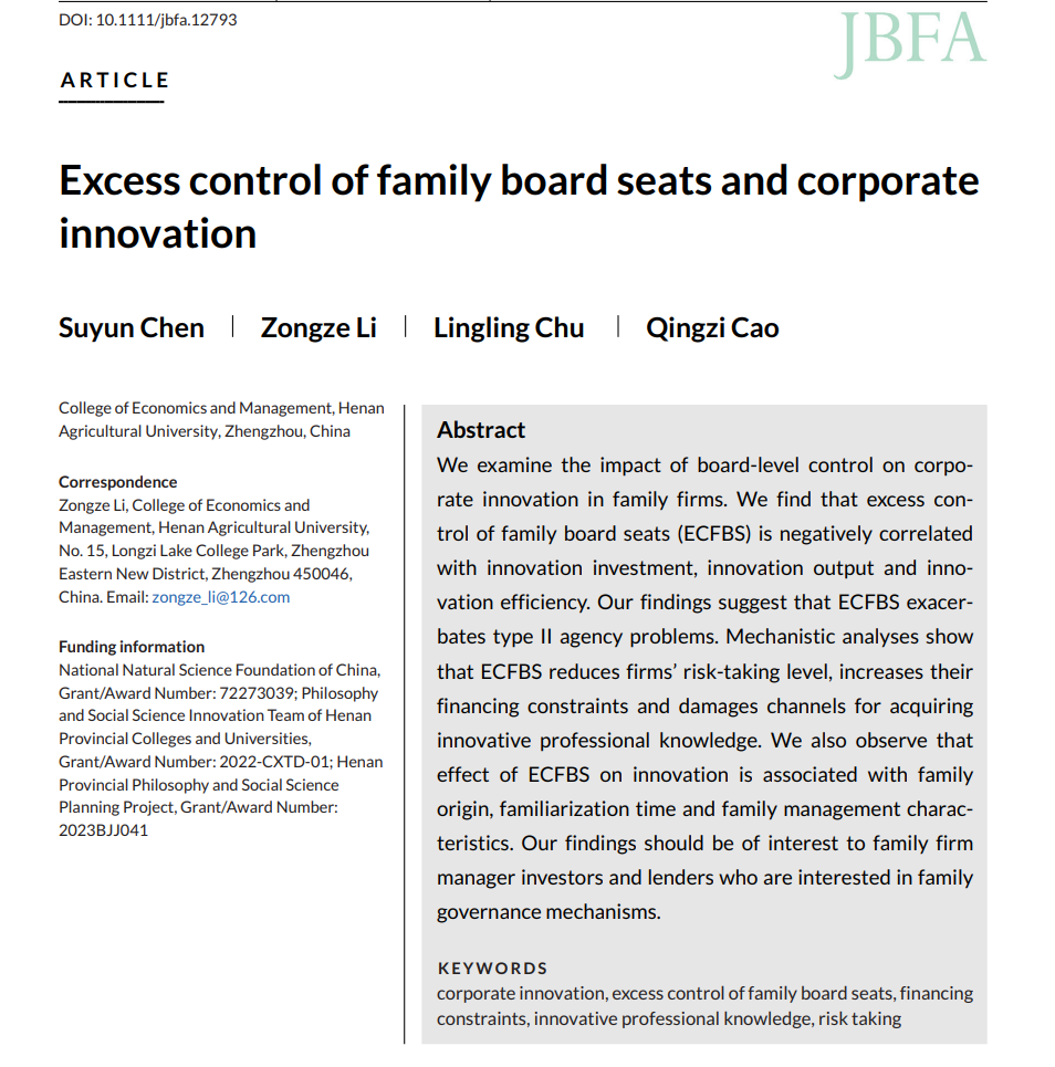 Journal of Business Finance & Accounting,论文题目为“Excess control of family board seats and corporate innovation”,陈素云教授为论文第一作者,博士生李宗泽为通讯作者,抖阴